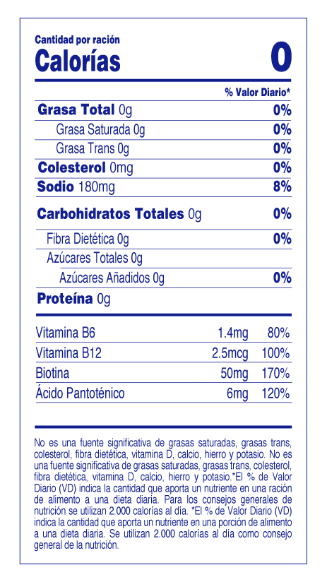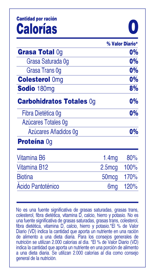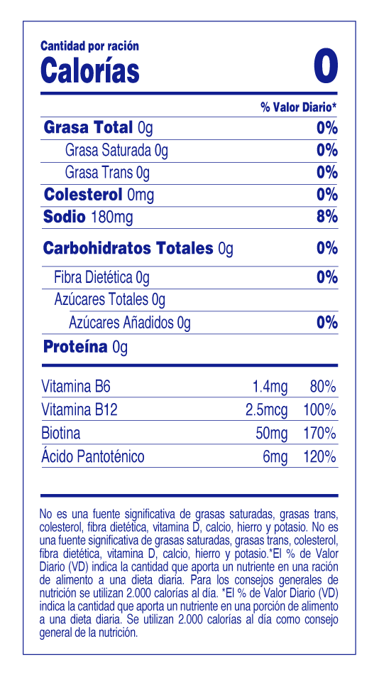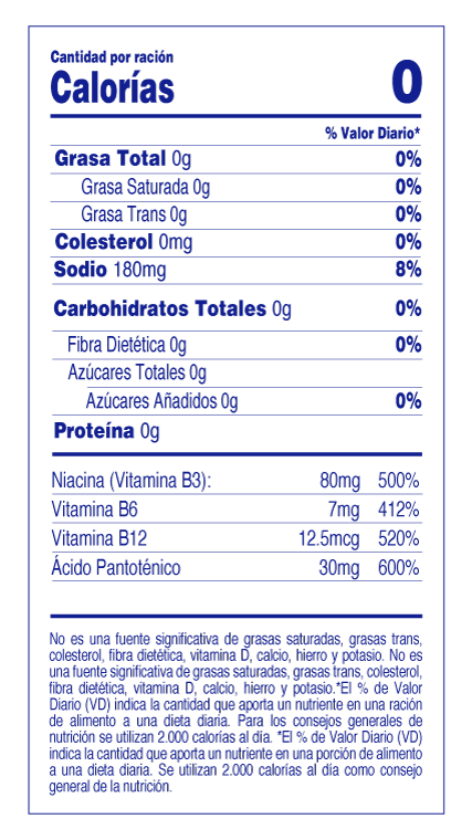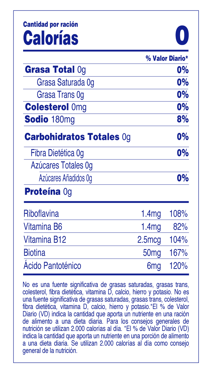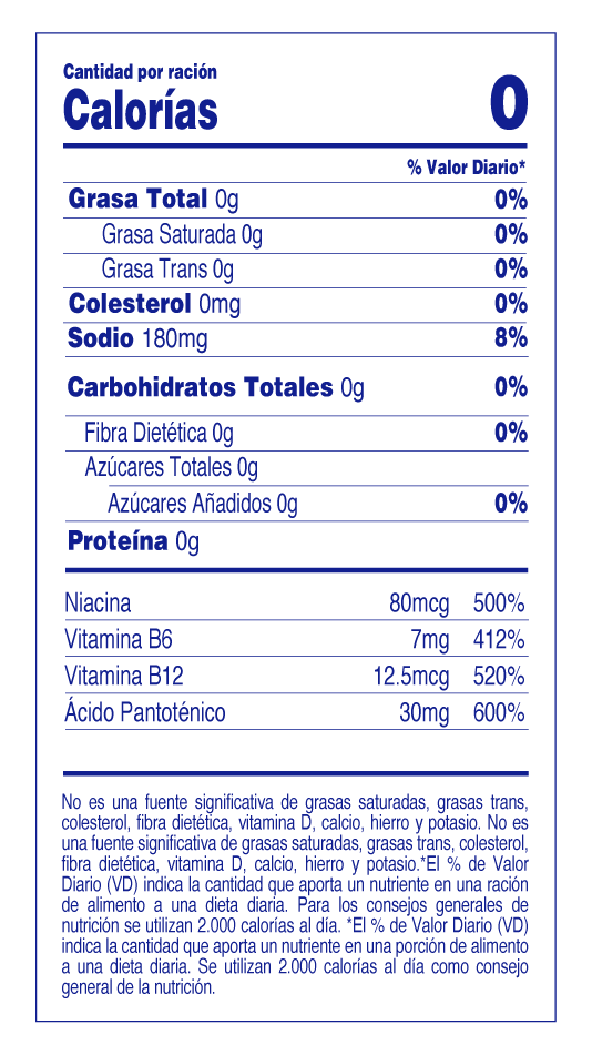 Artificial, Color añadido, Cafeína, Inositol, Acesulfamo de potasio, Sucralosa, Calcio-d-Pantotenato, Clorhidrato de Piridoxina, D-Biotina, Cianocobalamina.