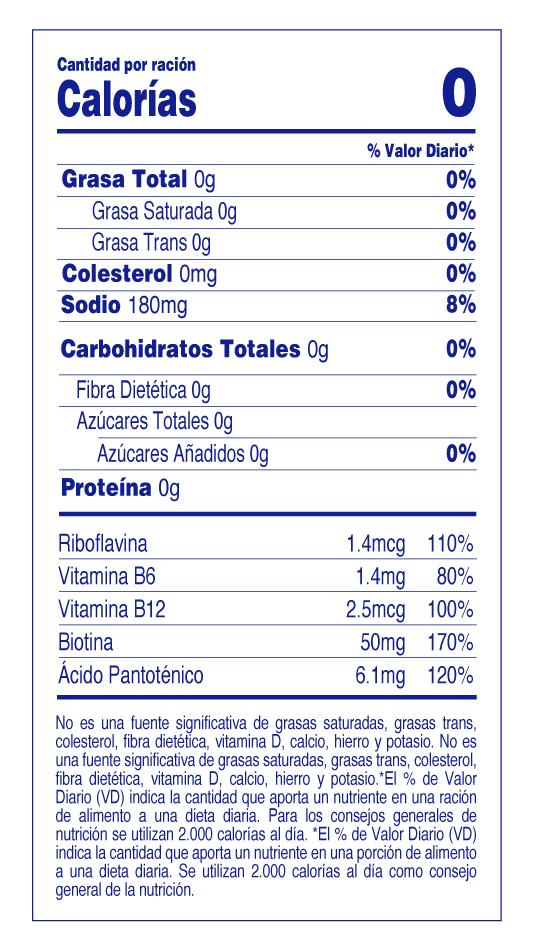 Artificial, Color añadido, Cafeína, Inositol, Acesulfamo de potasio, Sucralosa, Calcio-d-Pantotenato, Clorhidrato de Piridoxina, D-Biotina, Cianocobalamina.